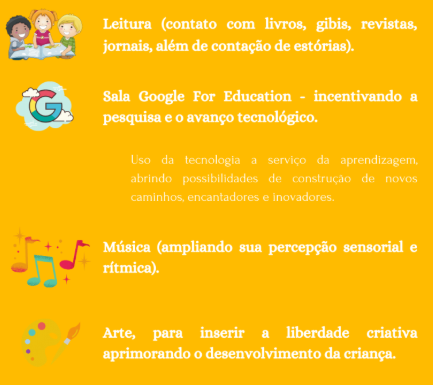 OBJETIVOS: Proporcionar aos alunos um ambiente de confiança, desenvolvendo a ética, as habilidades intelectuais, sociais, culturais e físicas. Por meio de um planejamento lúdico e diferenciado, atingimos os alunos e suas diversas formas de aprender. Criar bons hábitos de alimentação saudável, de higiene e estudo.