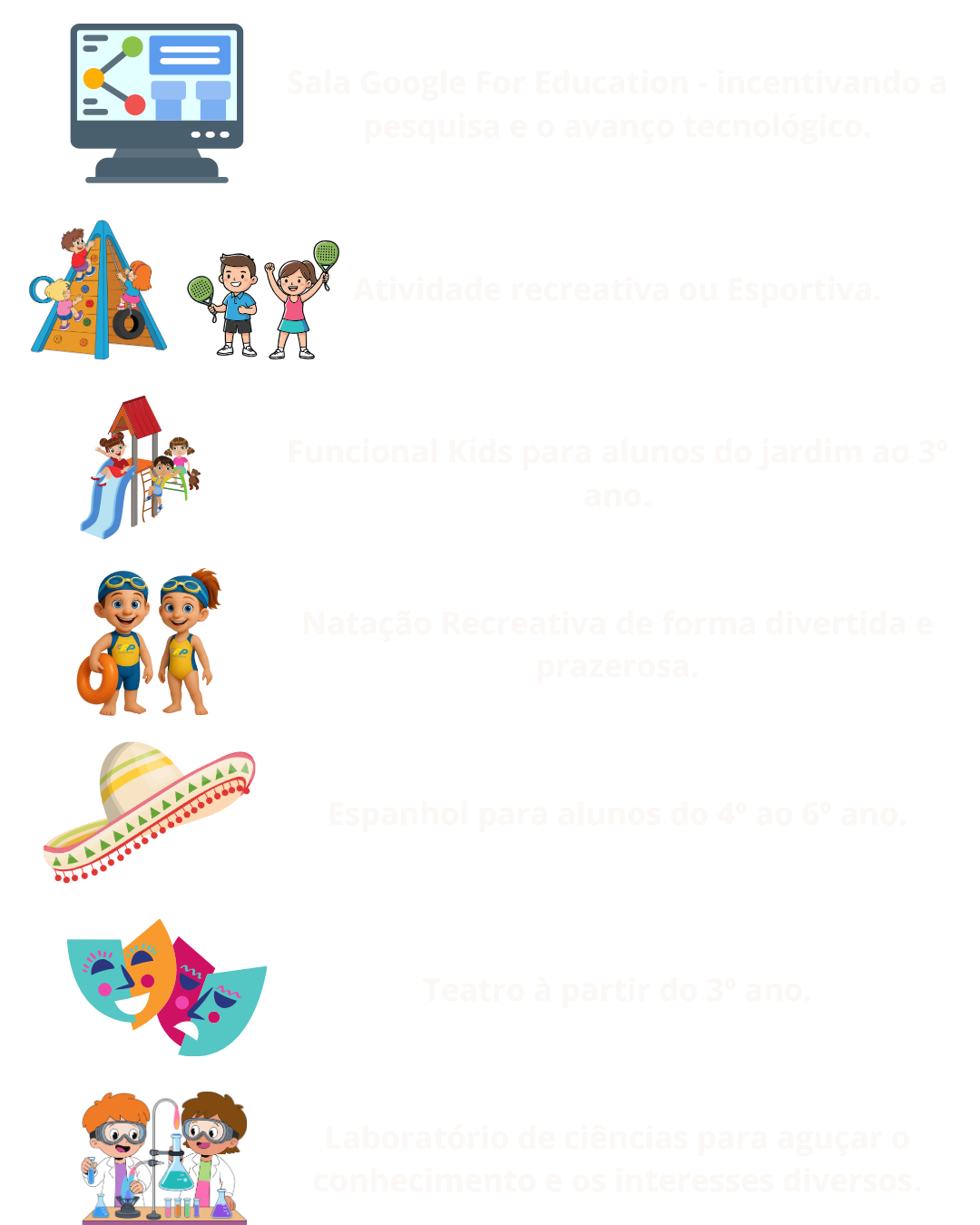 OBJETIVOS: Proporcionar aos alunos um ambiente de confiança, desenvolvendo a ética, as habilidades intelectuais, sociais, culturais e físicas. Por meio de um planejamento lúdico e diferenciado, atingimos os alunos e suas diversas formas de aprender. Criar bons hábitos de alimentação saudável, de higiene e estudo.